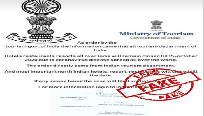 കൊറോണ വൈറസ് വ്യാപനത്തിന്റെ പശ്ചാത്തലത്തില് ഹോട്ടലുകളും റെസ്റ്റോറന്റുകളും ഒക്ടോബര് 15 വരെ അടച്ചിടാന് കേന്ദ്ര ടൂറിസം മന്ത്രാലയം ഉത്തരവിറക്കി എന്ന രീതിയില് സാമൂഹിക മാധ്യമങ്ങളില് പ്രചരിക്കുന്ന കത്ത് വ്യാജമാണെന്ന് മന്ത്രാലയം അറിയിച്ചു. കേന്ദ്ര ടൂറിസം മന്ത്രാലയം അത്തരത്തില് ഒരു കത്തും ഇറക്കിയിട്ടില്ലെന്നും അത്തരം വ്യാജ വാര്ത്തകള് ജനങ്ങള് വിശ്വസിക്കരുതെന്നും ഗവണ്മെന്റ് അറിയിച്ചു. കേന്ദ്ര ടൂറിസം മന്ത്രാലയം ഈ വ്യാജ കത്തിനെതിരെ മുംബൈ പോലീസിലെ സൈബര് ക്രൈം വിഭാഗത്തില് പരാതി നല്കിയിട്ടുണ്ട്. യൂണിറ്റു ഈ ഫാക്ട് ചെക്ക് വാര്ത്ത വ്യാജമാണെന്ന് അറിയിച്ചിരുന്നെങ്കിലും പിന്നീടും വ്യാജ സന്ദേശം പരക്കുകയായിരുന്നു. ഇത്തരം വ്യാജ സന്ദേശങ്ങള് അവഗണിക്കണമെന്നും ഔദ്യോഗിക വിവരങ്ങള് മാത്രമേ ജനങ്ങള് വിശ്വസിക്കാവൂ എന്നും ഗവണ്മെന്റ് അഭ്യര്ത്ഥിച്ചു.