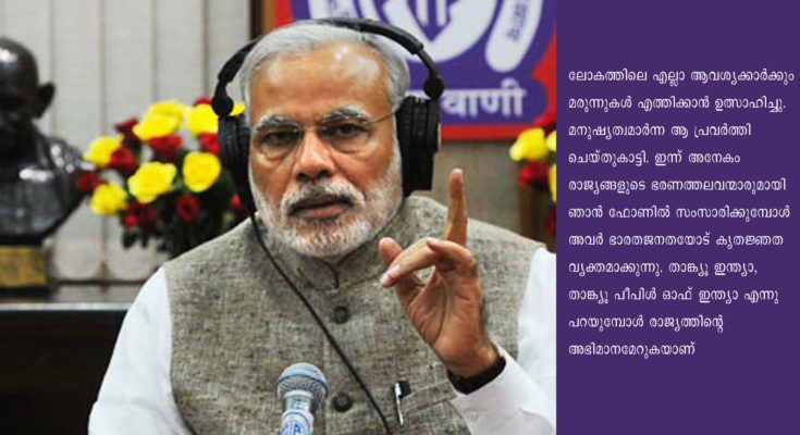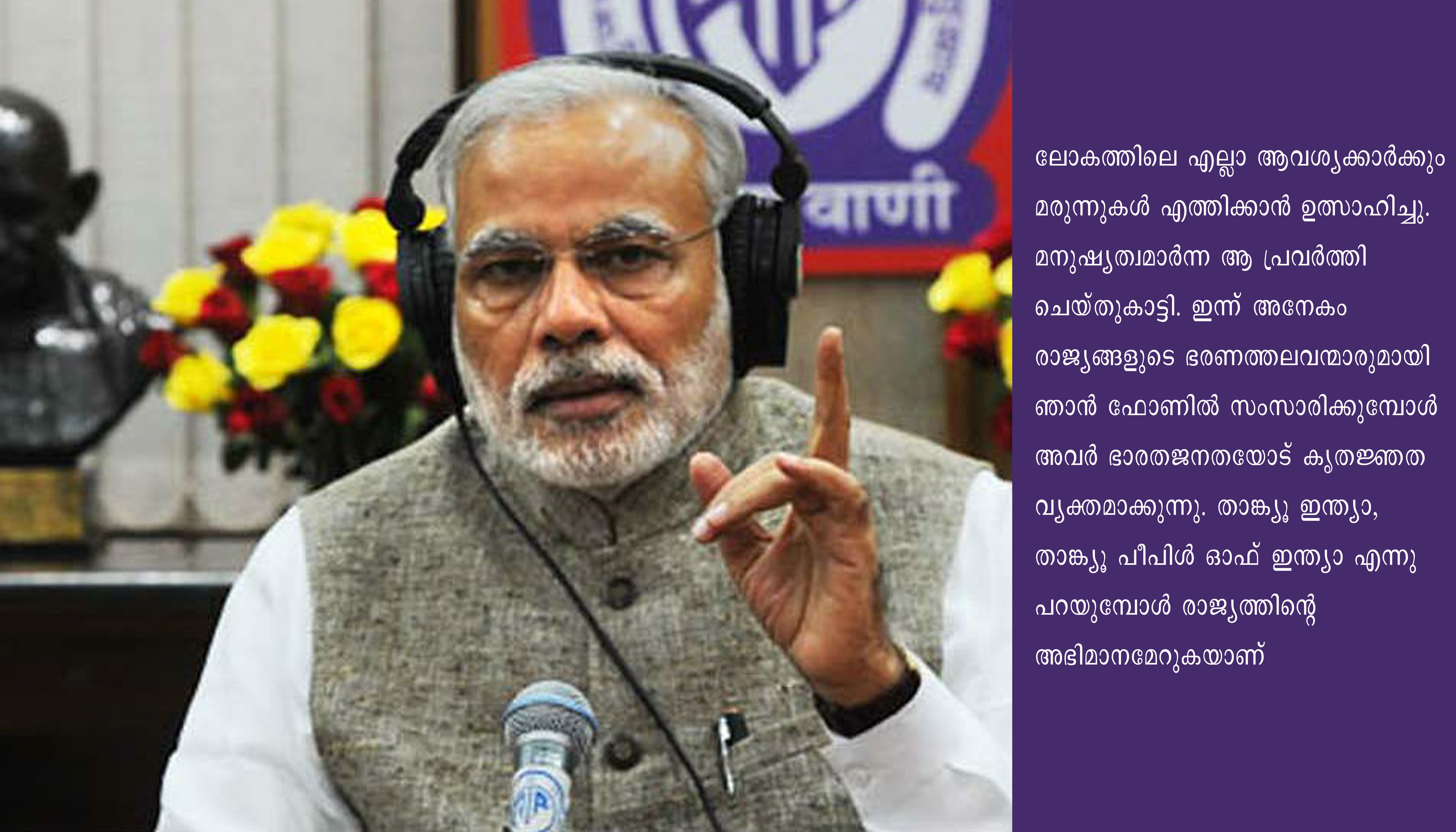 ലോകത്തിലെ എല്ലാ ആവശ്യക്കാര്ക്കും മരുന്നുകള് എത്തിക്കാന് ഉത്സാഹിച്ചു, മനുഷ്യത്വമാര്ന്ന ആ പ്രവര്ത്തി ചെയ്തുകാട്ടി. ഇന്ന് അനേകം രാജ്യങ്ങളുടെ ഭരണത്തലവന്മാരുമായി ഞാന് ഫോണില് സംസാരിക്കുമ്പോള് അവര് ഭാരതജനതയോട് കൃതജ്ഞത വ്യക്തമാക്കുന്നു. താങ്ക്യൂ ഇന്ത്യാ, താങ്ക്യൂ പീപിള് ഓഫ് ഇന്ത്യാ എന്നു പറയുമ്പോള് രാജ്യത്തിന്റെ അഭിമാനമേറുകയാണ്