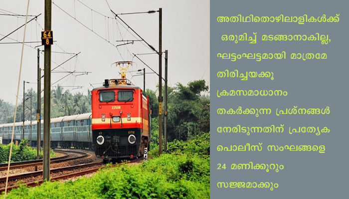 ഡി വൈ എസ് പി ഉദ്യോഗസ്ഥരുടെ നേതൃത്വത്തിലുളള സംഘം അതിഥി തൊഴിലാളികളെ പോകുമ്പോള് ശ്രദ്ധിക്കേണ്ട മുന്കരുതലുക ളെ പറ്റി ബോധവത്കരണം നടത്താന് നിയോഗിച്ചു. അതിഥിതൊഴിലാളികള്ക്ക് ഒരുമിച്ച് മടങ്ങാനാകില്ല, ഘട്ടംഘട്ടമായി മാത്രമേ തിരിച്ചയക്കൂ തുടങ്ങിയ കാര്യങ്ങള് പറഞ്ഞുമനസ്സിലാക്കാന് ഹോം ഗാര്ഡുകളുടെയും കേന്ദ്രസേനകളിലെ അതിഥി തൊഴിലാളികളുടെ ഭാഷ അറിയാവുന്ന ഉദ്യോഗസ്ഥരുടെയും സേവനം ഉപയോഗിക്കും. ഏതെങ്കിലും രീതിയില് ക്രമസമാധാന പ്രശ്നങ്ങള് ഉണ്ടായാല് അത്തരം പ്രശ്നങ്ങളെ നേരിടുന്നതിന് പ്രത്യേക പൊലീസ് സംഘങ്ങളെ 24 മണിക്കൂറും സജ്ജമാക്കി നിര്ത്തും. തീവണ്ടികള് ഇന്ന് പുറപ്പെടുമെന്ന വാര്ത്തകള് അറിഞ്ഞ് ഏതാനും സ്ഥലങ്ങളില് തൊഴിലാളികള് പ്രകടനം നടത്തിയിരുന്നു.അതിനെ തുടര്ന്നാണ് ഇത്തരം നിര്ദ്ദേശം.