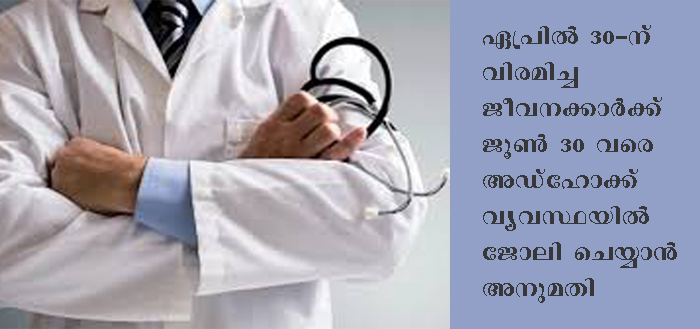 കോവിഡ്-19നെ ഫലപ്രദമായി പ്രിരോധിക്കാൻ സംസ്ഥാനത്തും ആരോഗ്യ മേഖലയിലും വലിയ പ്രവർത്തനങ്ങളാണ് നടക്കുന്നത്. വീടുകളിൽ നിരിക്ഷണത്തിൽ കഴിയുന്ന വ്യക്തികൾക്കും ആശുപത്രികളിൽ ചികിത്സയിലുള്ള രോഗികൾക്കും തടസം കൂടാതെ ആരോഗ്യ സേവനങ്ങൾ ലഭ്യമാക്കേണ്ടതുണ്ട്. മാർച്ച് 31-ന് വിരമിച്ച ജീവനക്കാർക്ക് ജൂൺ 30 വരെ അഡ്ഹോക്ക് വ്യവസ്ഥയിൽ ജോലി ചെയ്യാൻ അനുമതി നൽകിയിരുന്നു. എന്നാൽ കോവിഡ്-19 മഹാമാരിയെത്തുടർന്നുള്ള പ്രതിരോധ-ചികിത്സാ പ്രവർത്തനങ്ങൾ ഇപ്പോഴും തുടരുന്ന അവസ്ഥയാണ് ഉള്ളത്. അതിനാലാണ് ഏപ്രിൽ 30-ന് വിരമിച്ച കോവിഡ്-19 ചികിത്സയും പ്രതിരോധവുമായി ബന്ധപ്പെട്ട പ്രവർത്തനങ്ങളിൽ നേരിട്ട് ഇടപെട്ടിരുന്ന ജീവനക്കാരുടെ സേവനം ഉപയോഗപ്പെടുത്തുന്നതിനായി അഡ്ഹോക്ക് വ്യവസ്ഥയിൽ നിയമിക്കുന്നതിന് വീണ്ടും അനുമതി നൽകുന്നത്.