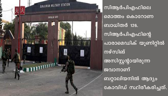സിആര്പിഎഫിന്റെ പാരാമെഡിക് യൂണിറ്റില് നഴ്സിങ് അസിസ്റ്റന്റായിരുന്ന ജവാനാണ് ബറ്റാലിയനില് ആദ്യം കോവിഡ് സ്ഥിരീകരിച്ചത്. ഏപ്രില് 17 മുതല് രോഗലക്ഷണങ്ങള് പ്രത്യക്ഷപ്പെട്ടതിനെത്തുടര്ന്നു നടത്തിയ പരിശോധനയില് ഏപ്രില് 21നാണ് രോഗം സ്ഥിരീകരിച്ചത്. തുടര്ന്ന് ഇദ്ദേഹത്തെ ഡല്ഹിയിലെ രാജീവ് ഗാന്ധി ആശുപത്രിയില് പ്രവേശിപ്പിച്ചു. രോഗം പടരുന്ന സാഹചര്യമുള്ളതിനാല് ഡ്യൂട്ടി വാഹനങ്ങളില് സാനിറ്റൈസര് ഉള്പ്പെടെയുള്ള മുന്കരുതല് ഉപകരണങ്ങള് കരുതാന് എല്ലാ കമ്പനികളും ശ്രദ്ധപുലര്ത്തണമെന്ന് സിആര്പിഅഫ് അധികൃതര് നിര്ദേശിച്ചു.