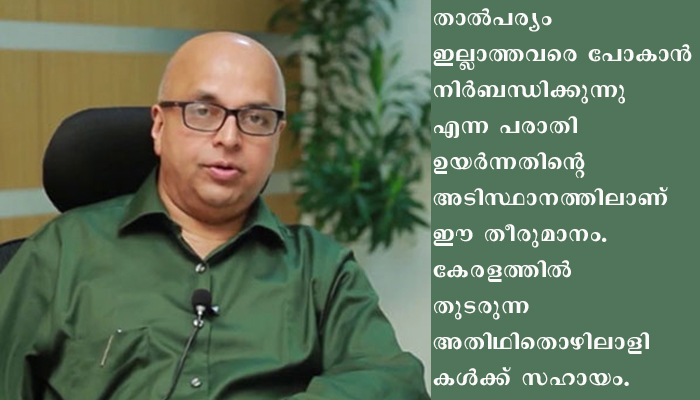 തൊഴിലാളികളുടെ നിരന്തരമായ പ്രകടനങ്ങളുടേയും പരാതികളുടേയും പശ്ചാത്തലത്തില് ആയിരുന്നു സംസ്ഥാനം മെയ് ഒന്നു മുതല് കേരളത്തില് നിന്നും അതിഥിതെഴിലാളികളെ മടക്കി അയക്കാന് ട്രയിന് സര്വ്വീസ് ആരംഭിച്ചത്.