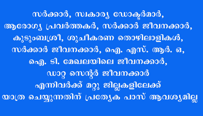 മറ്റു ജില്ലകളിലേക്കുള്ള യാത്രാ പാസ് സംബന്ധിച്ച് ചില കേന്ദ്രങ്ങളിൽ ആശയക്കുഴപ്പം ഉണ്ടായ സാഹചര്യത്തിലാണ് മുഖ്യമന്ത്രി ഇത് വ്യക്തമാക്കിയത്. വൈകിട്ട് ഏഴു മണിക്കും രാവിലെ ഏഴു മണിക്കും ഇവർക്ക് യാത്രാ നിരോധനവും ബാധകമല്ല. മറ്റുള്ളവർക്ക് അത്യാവശ്യ കാര്യങ്ങൾക്ക് അന്തർജില്ലാ യാത്രയ്ക്ക് പോലീസിന്റെ പാസ് വേണമെന്ന് മുഖ്യമന്ത്രി പറഞ്ഞു.