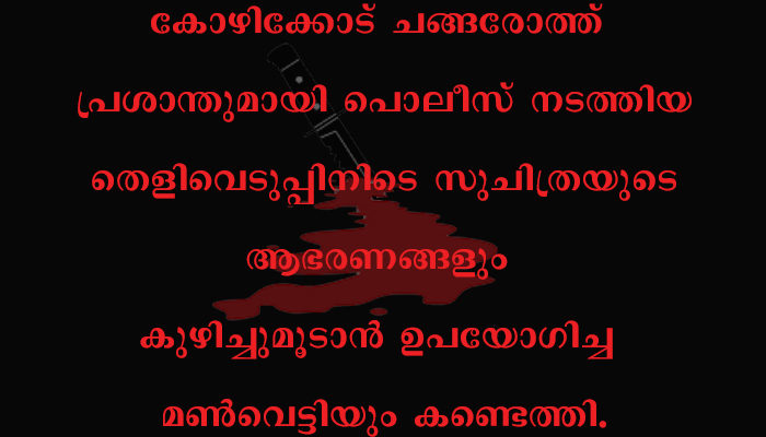 മാര്ച്ച് 20 മുതല് സുചിത്രയെ കാണാനില്ലെന്നു കാട്ടി ബന്ധുക്കള് നല്കിയ പരാതിയെത്തുടര്ന്നു നടന്ന അന്വേഷണത്തിലാണ് കൊലപാതകത്തിന്റെ ചുരുളഴിഞ്ഞത്. തുടര്ന്ന് പാലക്കാട് മണലില് വാടകയ്ക്ക് താമസിച്ചിരുന്ന പ്രശാന്തിനെ കസ്റ്റഡിയിലെടുക്കുകയായിരുന്നു.