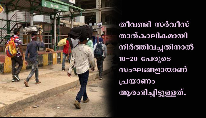 ബംഗളൂരു: അവസാനനിമിഷം ട്രെയിനുകള് റദ്ദാക്കി; ആയിരക്കണക്കിന് ഇതരസംസ്ഥാന തൊഴിലാളികള് ബംഗളൂരുവില്നിന്ന് യുപിയിലേക്കും ബിഹാറിലേക്കും കാല്നടയായി പുറപ്പെട്ടു. ലോക്ഡൗണ് പ്രഖ്യാപിച്ചതിനാല് സംസ്ഥാനത്ത് കുടുങ്ങിയ ഇതരസംസ്ഥാന തൊഴിലാളികള്ക്ക് നാട്ടിലേക്ക് മടങ്ങാനുള്ള തീവണ്ടി സര്വീസ് താത്കാലികമായി നിര്ത്തിവച്ചതിനാലാണ് അവര് നടക്കാന് ആരംഭിച്ചത്. 10-20 പേരുടെ സംഘങ്ങളായാണ് പ്രയാണം ആരംഭിച്ചിട്ടുള്ളത്. എന്നാല്, തൊഴിലാളികളോട് സംസ്ഥാനത്തുതന്നെ തുടരാന് കര്ണാടക സര്ക്കാര് ആവശ്യപ്പെട്ടു.