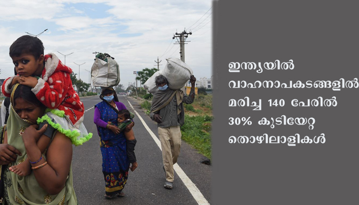 റിപ്പോര്ട്ട് കാലയളവില് ഇന്ത്യയില് വാഹനാപകടങ്ങളില് 140 പേര് മരിച്ചു. മരണങ്ങളില് 30 ശതമാനം പേര് കുടിയേറ്റ തൊഴിലാളികളാണ്. ലോക്ഡൗണ് കാലത്ത് പഞ്ചാബിലാണ് ഏറ്റവും കൂടുതല് റോഡപകടമരണങ്ങള് ഉണ്ടായത്. കേരളം, കര്ണാടകം, ഡല്ഹി എന്നിവിടങ്ങളിലാണ് കുറവ്. ലോക്ഡൗണിനെത്തുടര്ന്ന് രാജ്യത്താകെ വാഹനഗതാഗതം തടഞ്ഞതിനാല് വാഹനാപകടങ്ങളില് ഗണ്യമായ കുറവുണ്ടായി.