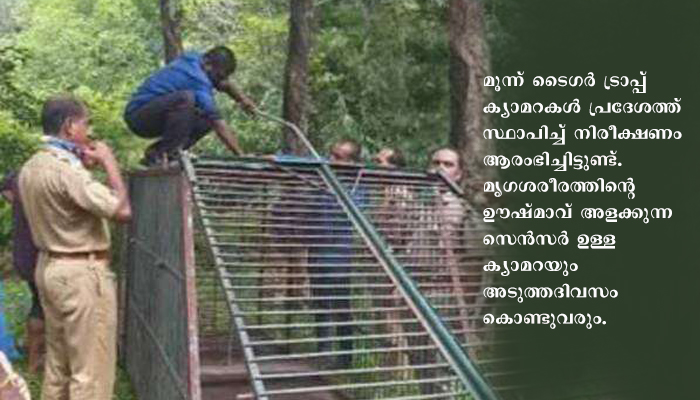 ശനിയാഴ്ച ഉച്ചയോടെ വനപാലകര് പ്ലാന്റേഷന് സി ഡിവിഷനിലെ കളക്ഷന് സെന്ററിനു സമീപമാണ് കടുവാക്കെണി ഒരുക്കിയത്. ഫോറസ്റ്റ് വെറ്ററിനറി ഡോക്ടര്മാരുടെ നിര്ദേശപ്രകാരം കൂട്ടില് ആടിനെ കെട്ടിയിട്ടുണ്ട്. ഒരു കെണികൂടി ഇന്ന് പ്രദേശത്ത് സ്ഥാപിക്കാന് ആലോചനയുണ്ട്. കൂടാതെ കടുവയെ കണ്ടെത്താന് ആധുനിക ടൈഗര് ട്രാപ്പ് ക്യാമറകളും സ്ഥാപിക്കും. ഇതിനു മുന്നോടിയായി പെരിയാര് കടുവാ സങ്കേതത്തില്നിന്ന് എത്തിച്ച മൂന്ന് ടൈഗര് ട്രാപ്പ് ക്യാമറകള് പ്രദേശത്ത് സ്ഥാപിച്ച് നിരീക്ഷണം ആരംഭിച്ചിട്ടുണ്ട്. മൃഗശരീരത്തിന്റെ ഊഷ്മാവ് അളക്കുന്ന സെന്സര് ഉള്ള ക്യാമറയും അടുത്തദിവസം കൊണ്ടുവരും.