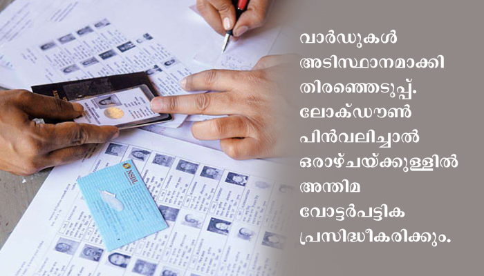 ലോക്ക്ഡൗണ് നിയന്ത്രണത്തില് ഇളവുണ്ടായാലുടന് വോട്ടര്പട്ടിക പ്രസിദ്ധീകരിക്കാന് നിര്ദേശം നല്കും. വിട്ടുപോയവരുടെ പേരുചേര്ക്കാന് ഓഗസ്റ്റ് ആദ്യവാരം അവസരം നല്കും. ഇതുവരെ 11 ലക്ഷം പുതിയ വോട്ടര്മാരെ ചേര്ത്തു. 2020 ജനുവരി ഒന്ന് അടിസ്ഥാനപ്പെടുത്തിയാണ് പ്രായം കണക്കാക്കുക. പുതിയ വോട്ടര്മാരെ ചേര്ക്കാനുള്ള ഹിയറിങും തെളിവെടുപ്പും സമ്പര്ക്കം ഒഴിവാക്കി നടത്തുകയെന്നത് കനത്ത വെല്ലുവിളിയാണ്. കോവിഡ് ഭീതി പൂര്ണമായും ഒഴിവായിട്ട് തിരഞ്ഞെടുപ്പിനു കഴിയില്ലെന്നാണ് കമ്മീഷന്റെ വിലയിരുത്തല്. അങ്ങനെയെങ്കില് സുരക്ഷാ മാനദണ്ഡങ്ങള് പാലിച്ചുകൊണ്ട് തിരഞ്ഞെടുപ്പ് നടപടികള് പൂര്ത്തിയാക്കേണ്ടിവരും