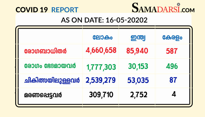 അതേസമയം രോഗം സ്ഥിരീകരിച്ച് ചികിത്സയില് ആയിരുന്ന നാലുപേരുടെ പരിശോധനാഫലം നെഗറ്റീവ് ആയി. വയനാട്, കണ്ണൂര് ജില്ലകളില് നിന്നും രണ്ട് പേരുടെ വീതം പരിശോധനാ ഫലമാണ് നെഗറ്റീവ് ആയത്. ഇതോടെ 87 പേരാണ് രോഗം സ്ഥിരീകരിച്ച് ഇപ്പോള് ചികിത്സയിലുള്ളത്. 497 പേര് ഇതുവരെ കോവിഡില് നിന്നും മുക്തി നേടി.