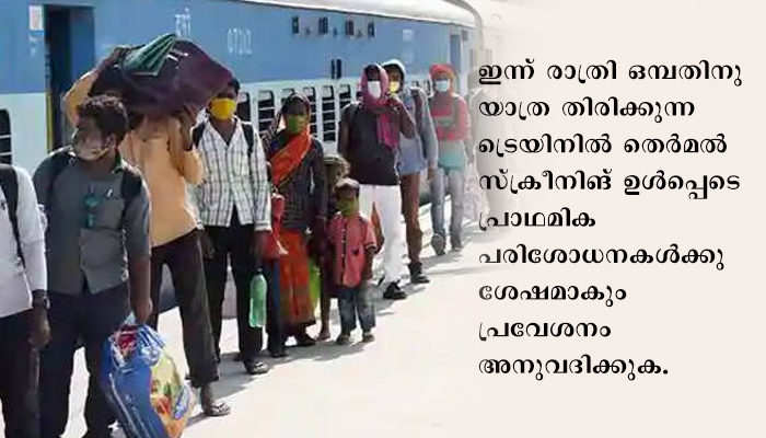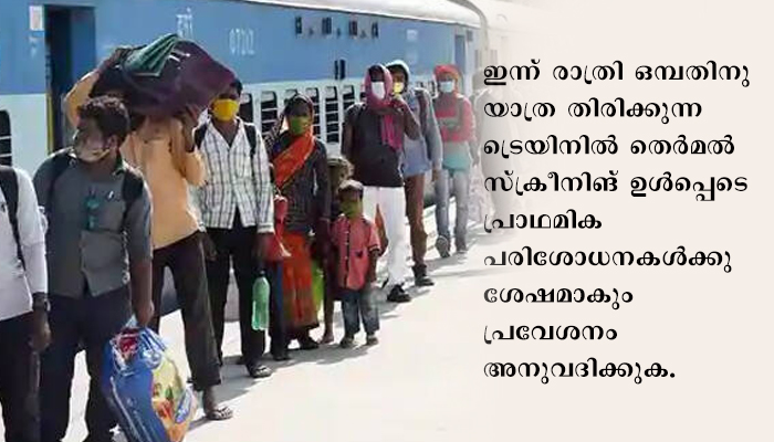 കഴിഞ്ഞ ദിവസങ്ങളിലായി ബിഹാര്‍, ഉത്തര്‍പ്രദേശ് സംസ്ഥാനങ്ങളിലേക്ക് മൂന്നു ട്രെയിനുകള്‍ പുറപ്പെട്ടിരുന്നു. 3870 അതിഥി തൊഴിലാളികളാണ് ഈ ട്രെയിനുകളില്‍ സ്വദേശങ്ങളിലേക്ക് മടങ്ങിയത്. 2280 അതിഥി തൊഴിലാളികള്‍ ഉത്തര്‍പ്രദേശിലേക്കും 1140 പേര്‍ ബിഹാറിലേക്കും 450 പേര്‍ മധ്യപ്രദേശിലേക്കുമാണ് നേരത്തെ ശ്രമിക് എക്‌സപ്രസ് ട്രെയിനുകളില്‍ മടങ്ങിയത്.
