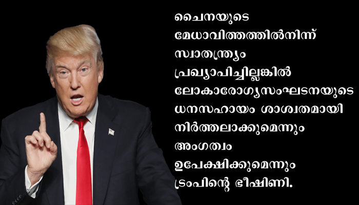 കോറോണ രോഗാണുബാധ കൈകാര്യം ചെയ്യുന്നതില് ലോകാരോഗ്യ സംഘടനയ്ക്കു സംഭവിച്ച പിഴവുകള് കത്തില് ട്രംപ് വിശദീകരിക്കുന്നുണ്ട്. ചൈനയോട് പക്ഷപാതം കാണിക്കുന്നുവെന്ന് ആരോപിച്ച് ഏപ്രില് പകുതിയോടെ ലോകാരോഗ്യ സംഘടനയ്ക്കുള്ള ധനസഹായം ട്രംപ് താല്ക്കാലികമായി നിര്ത്തിയിരുന്നു. ധനസഹായം ശാശ്വതമായി നിര്ത്തലാക്കുമെന്നാണ് ട്രംപിന്റെ ഇപ്പോഴത്തെ ഭീഷണി. വൈറസ് പൊട്ടിപ്പുറപ്പെട്ടതിനെ സംബന്ധിച്ച ആദ്യ റിപ്പോര്ട്ടുകള് സംഘടന അവഗണിച്ചെന്നും ട്രംപ് കത്തില് പറയുന്നു. നിങ്ങളും സംഘടനയും എടുത്ത തെറ്റായ നടപടികള്മൂലം ലോകത്തിന് വലിയ നഷ്ടങ്ങളാണു സംഭവിച്ചത്. ചൈനയുടെ മേധാവിത്തത്തില്നിന്ന് സ്വാതന്ത്ര്യം പ്രഖ്യാപിക്കുകയാണ് ലോകാരോഗ്യസംഘടനയ്ക്കു മുന്നിലുള്ള ഏക പോംവഴിയെന്നും ട്രംപ് ഭീഷണിപ്പെടുത്തുന്നു.