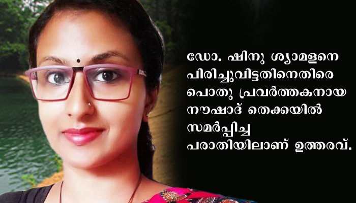 ഡോ. ഷിനു ശ്യാമളനെ പിരിച്ചുവിട്ടതിനെതിരെ പൊതു പ്രവർത്തകനായ നൗഷാദ് തെക്കയിൽ സമർപ്പിച്ച പരാതിയിലാണ് ഉത്തരവ്. പോലീസിനും ജില്ലാ മെഡിക്കൽ ഓഫീസർക്കും ഡോക്ടർ വിവരം കൈമാറിയെങ്കിലും രോഗ ബാധിതനാണെന്ന് സംശയിക്കുന്നയാളെ അധികൃതർ കണ്ടെത്തുന്നതിന് മുമ്പ് അയാൾ വിദേശത്തേക്ക് കടന്നതായി പരാതിയിൽ പറയുന്നു.
