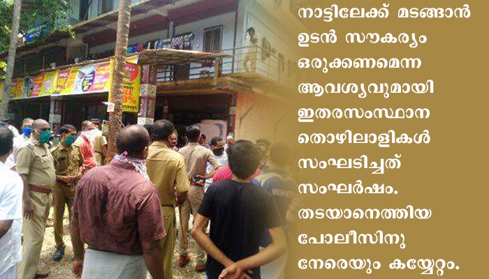 കണ്ണൂര്‍: നാട്ടിലേക്ക് മടങ്ങാന്‍ ഉടന്‍ സൗകര്യമൊരുക്കണമെന്ന ആവശ്യവുമായി ഇതരസംസ്ഥാന തൊഴിലാളികള്‍ സംഘടിച്ചത് സംഘര്‍ഷത്തിനിടയാക്കി. തടയാനെത്തിയ പൊലീസിനുനേരെ ചിലര്‍ കൈയേറ്റത്തിനു മുതിര്‍ന്നു. കൂടുതല്‍ പൊലീസെത്തി ബലംപ്രയോഗിച്ച് തൊഴിലാളികളെ മടക്കിവിടുകയായിരുന്നു. സംഭവത്തില്‍ മൂന്നുപേര്‍ കസ്റ്റഡിയിലായി. ചങ്ങരോത്ത് പഞ്ചായത്തിലെ പാലേരി പാറക്കടവില്‍ ചൊവ്വാഴ്ച രാവിലെയാണ് സംഭവം. കൂട്ടത്തില്‍ കുറേപേര്‍ക്ക് ശ്രമിക് സ്പെഷ്യല്‍ ട്രെയിനില്‍ മടങ്ങാന്‍ കഴിഞ്ഞതോടെ തങ്ങള്‍ക്കും സൗകര്യം ഒരുക്കണമെന്ന് മറ്റുള്ളവര്‍ ആവശ്യപ്പെട്ടിരുന്നു.