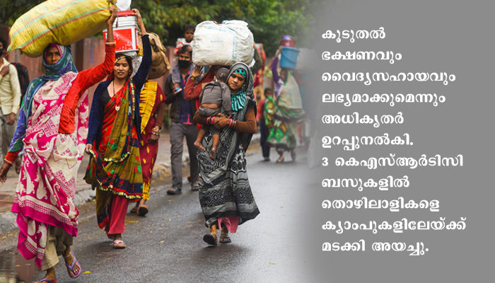 ചൊവ്വാഴ്ച രാവിലെ ഒമ്പതു മണിയോടെയാണ് ട്രാക്കിലൂടെ കൂട്ടമായി നടന്നു വരുന്ന തൊഴിലാളികളെ ആര്പിഎഫ് കണ്ടത്. തുടര്ന്ന് കണ്ണൂര് ടൗണ് പോലീസെത്തി താമസസ്ഥലത്തേക്ക് മടങ്ങണമെന്ന് തൊഴിലാളികളോട് ആവശ്യപ്പെട്ടു. ക്യാംപുകളില് ചുരുങ്ങിയ അളവിലുള്ള ഭക്ഷ്യധാന്യം മാത്രമാണു ലഭിച്ചതെന്നായിരുന്നു തൊഴിലാളികളുടെ പ്രധാന ആരോപണം. തൊഴിലാളികള് പിരിഞ്ഞുപോകാന് കൂട്ടാക്കാതെ റെയില്വേ സ്റ്റേഷന് പരിസരത്ത് കൂട്ടംകൂടിയതോടെ ചര്ച്ച നടത്താന് റവന്യൂ, തൊഴില് വകുപ്പ് ഉദ്യോഗസ്ഥരെത്തി. ക്യാംപുകളില് കൂടുതല് ഭക്ഷണവും വൈദ്യസഹായവും ലഭ്യമാക്കുമെന്നും അധികൃതര് ഉറപ്പുനല്കി. തുടര്ന്ന് മൂന്ന് കെഎസ്ആര്ടിസി ബസുകളില് തൊഴിലാളികളെ ക്യാംപുകളിലേയ്ക്ക് മടക്കി അയച്ചു. മടങ്ങാന് കൂട്ടാക്കാതെ മടിച്ചുനിന്നവരെ ബലംപ്രയോഗിച്ചാണ് ബസില് കയറ്റിയത്.