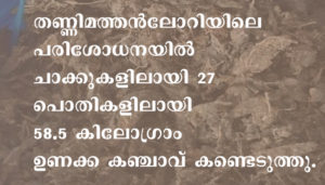 നിലമ്പൂര്: തണ്ണിമത്തന് ലോറിയില് ഒളിപ്പിച്ചുകടത്തിയ 58 കിലോ കഞ്ചാവ് പിടിച്ചു; രണ്ടുപേര് അറസ്റ്റില്. വയനാട് വൈത്തിരി പന്തിപ്പൊയില് കൂനന്കരിയാട് വീട്ടില് ഹാഫീസ്(29), കോഴിക്കോട് നരിക്കുനി സ്വദേശി വൈലാങ്കര സഫ്ദര് ഹാഷ്മി(26) എന്നിവരെയാണ് നിലമ്പൂര് എക്സൈസ് ഇന്സ്പെക്ടറും സംഘവും അറസ്റ്റ് ചെയ്തത്. ബുധനാഴ്ച രാവിലെ നിലമ്പൂര് മമ്പാട് വില്ലേജിലെ സ്വകാര്യ ആശുപത്രിക്ക് സമീപംവച്ചാണ് ഇവരെ കസ്റ്റഡിയിലെത്തത്. രഹസ്യവിവരത്തിന്റെ അടിസ്ഥാനത്തിലാണ് നിലമ്പൂര്- ഊട്ടി റോഡില് തണ്ണിമത്തന് കയറ്റിവരുകയായിരുന്ന കെഎല് 58 ക്യൂ 7386 ലോറി പിടികൂടിയത്. നിലമ്പൂര് എക്സൈസ് ഇന്സ്പെക്ടര് ജി കൃഷ്ണകുമാറും സംഘവും നടത്തിയ പരിശോധനയില് ചാക്കുകളില് 27 പൊതികളിലായി 58.5 കിലോഗ്രാം ഉണക്ക കഞ്ചാവ് കണ്ടെടുത്തു. സംസ്ഥാനത്തിനു പുറത്തുനിന്നാണ് തണ്ണിമത്തന്ലോറിയില് കഞ്ചാവ് വില്പനക്കായി കേരളത്തില് എത്തിച്ചത്. പിടികൂടിയ കഞ്ചാവിന് 50 ലക്ഷം രൂപ വിലമതിക്കുമെന്നും കൂടുതല് കഞ്ചാവ് ജില്ലയിലേക്ക് കടത്താന് സാധ്യതയുള്ളതിനാല് പരിശോധന കര്ശനമാക്കിയിരിക്കുകയാണെന്നും എക്സൈസ് സംഘം അറിയിച്ചു.