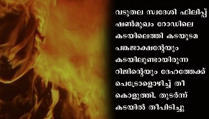 കൊച്ചി: ഓട്ടോ ഡ്രൈവര്‍ പെട്രോള്‍ ഒഴിച്ച് തീകൊളുത്തി ചികിത്സയിലായിരുന്നു യുവാവ് മരിച്ചു. ആക്രമണത്തില്‍ ഗുരുതരമായി പൊള്ളലേറ്റ് ചികിത്സയിലായിരുന്ന സ്വകാര്യ ആശുപത്രിയിലെ ജീവനക്കാരനായ റിജിന്‍ ദാസ്( 35) ആണ് മരിച്ചത്. പൊള്ളലേറ്റ പങ്കജാക്ഷന്റെ നില ഇപ്പോഴും ഗുരുതരമായി തുടരുകയാണ്. വടുതല സ്വദേശി ഫിലിപ്പ് എന്നയാളാണ് ഷണ്‍മുഖം റോഡിലെ കടയിലെത്തി കടയുടമ പങ്കജാക്ഷന്റേയും കടയിലുണ്ടായിരുന്ന റിജിന്റെയും ദേഹത്തേക്ക് പെട്രോളൊഴിച്ച് തീ കൊളുത്തിയത്. ഇതേത്തുടര്‍ന്ന് കടയില്‍ വലിയ തീപിടുത്തമുണ്ടായി. അതിനുശേഷം ഫിലിപ്പ് സ്വന്തം ശരീരത്ത് പെട്രോള്‍ ഒഴിച്ചശേഷം തീകൊളുത്തി ജീവനൊടുക്കുകയായിരുന്നു. മാനസികാസ്വാസ്ഥ്യമുള്ള ഫിലിപ്പിന് പങ്കജാക്ഷനോട് മുന്‍വൈരാഗ്യമുണ്ടായിരുന്നു. ഇതാവാം അക്രമത്തിനു കാരണമെന്ന് പൊലീസ് സൂചിപ്പിച്ചു.