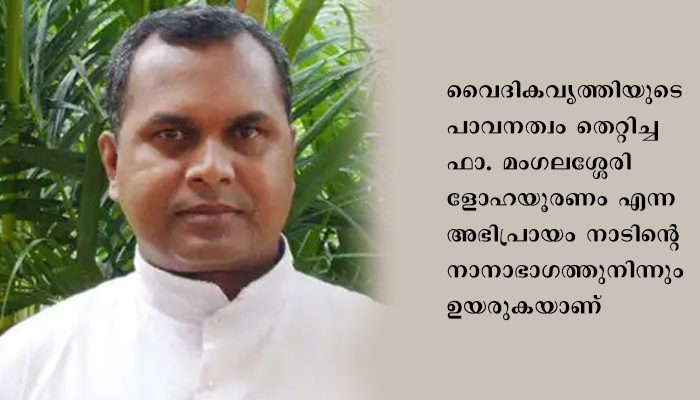 സംഭവം തെളിവുസഹിതം പുറത്തുവന്നതോടെ വിശ്വാസികള് രൂപതാ നേതൃത്വത്തെ വിവരമറിയിക്കുകയും രൂപതയുടെ അന്വേഷണത്തില് സത്യാവസ്ഥ ബോധ്യപ്പെടുകയും ചെയ്തതോടെയാണ് അച്ചനെ മാറ്റിനിര്ത്തുകയും ചെയ്തിരിക്കുകയാണ്. വൈദികവൃത്തിയുടെ പാവനത്വം തെറ്റിച്ച ഫാ. മംഗലശ്ശേരി ളോഹയൂരണം എന്ന അഭിപ്രായം നാടിന്റെ നാനാഭാഗത്തുനിന്നും ഉയരുകയാണ്. എന്നാല്, സഭയില് ഉന്നതസ്ഥാനങ്ങള് വഹിച്ച ഇദ്ദേഹത്തെ സംരക്ഷിക്കാനുള്ള ശ്രമങ്ങളും അണിയറയില് നടക്കുന്നുണ്ട്. അതേസമയം സാമൂഹിക മാധ്യമങ്ങളില് പ്രചരിക്കുന്ന ദൃശ്യങ്ങളുടെ അടിസ്ഥാനത്തില് വീട്ടമ്മ സൈബര്സെല്ലിനെ സമീപിക്കാന് ഒരുങ്ങുകയാണെന്നും സൂചനയുണ്ട്.