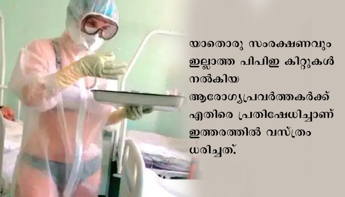 എന്നാല്, കൊറോണ രോഗികളെ ശുശ്രൂഷിക്കാന് ആവശ്യമായ വസ്ത്രങ്ങളും ശരിയായ പിപിഇ കിറ്റുകളും ഈ നഴ്സിനു നല്കിയിട്ടില്ലെന്നും അതില് പ്രതിഷേധിച്ചാണ് ഇത്തരത്തില് വസ്ത്രം ധരിച്ച് ഡ്യൂട്ടിയെടുക്കാന് എത്തിയതെന്നുമാണ് സഹപ്രവര്ത്തകര് പറയുന്നത്. യാതൊരു സംരക്ഷണവും ഇല്ലാത്ത പിപിഇ കിറ്റുകള് ആരോഗ്യപ്രവര്ത്തകര്ക്ക് നല്കിയ ആശുപത്രി അധികൃതര്ക്കെതിരേ ശക്തമായ വിമര്ശനമാണ് സമൂഹമാധ്യമങ്ങളില് ഉയരുന്നത്. സുതാര്യ പിപിഇ കിറ്റ് ധരിച്ച നഴ്സിന്റെ ചിത്രങ്ങള് കാട്ടുതീപോലെ സമൂഹമാധ്യമങ്ങളില് പടര്ന്നു. എന്നാല്, യൂണിഫോം കോഡ് ലംഘിച്ചതിന് നഴ്സിനെതിരേ നടപടിയെടുക്കാനാണ് ആശുപത്രി അധികൃതരുടെ നീക്കം.