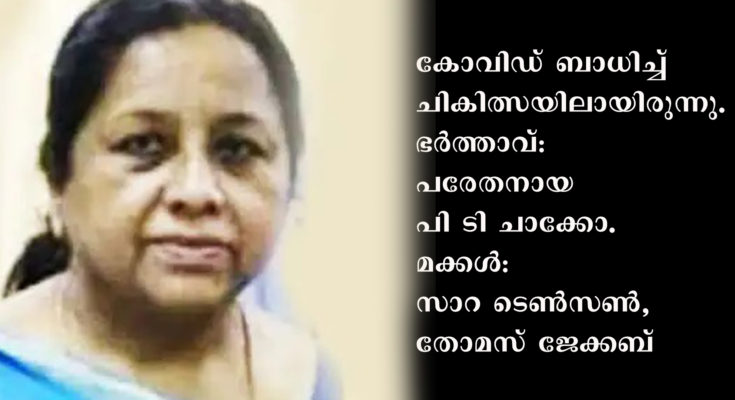 കുവൈത്ത്: കുവൈത്തില്‍ മലയാളി നഴ്‌സ് മരണമടഞ്ഞു. മാവേലിക്കര പുതുക്കളത്ത് ജയ്‌സണ്‍ വില്ലയില്‍ അന്നമ്മ ചാക്കോ(59) ആണ് മരിച്ചത്. കോവിഡ് ബാധിച്ച് ചികിത്സയിലായിരുന്നു. ഭര്‍ത്താവ് പരേതനായ പി ടി ചാക്കോ. മക്കള്‍ സാറ ടെണ്‍സണ്‍, തോമസ് ജേക്കബ്‌