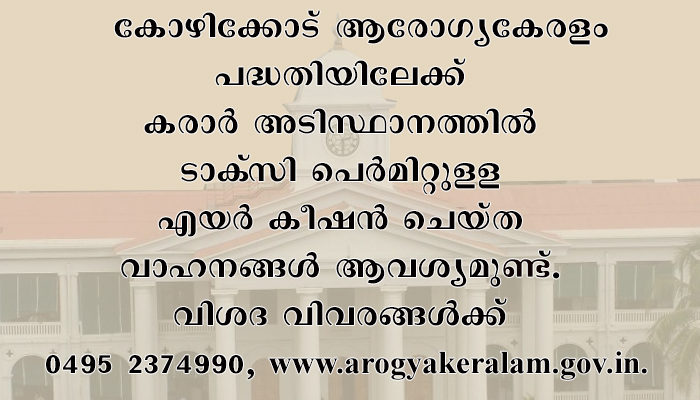 കോഴിക്കോട്: കോഴിക്കോട് ആരോഗ്യകേരളം പദ്ധതിയിലേക്ക് കരാര് അടിസ്ഥാനത്തില് ടാക്സി പെര്മിറ്റുളള എയര് കണ്ടീഷന് ചെയ്ത വാഹനങ്ങള് ആവശ്യമുണ്ട്. വിശദ വിവരങ്ങള്ക്ക് 0495 2374990, www.arogyakeralam.gov.in.