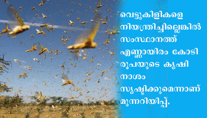 വൈകീട്ട് ഏഴുമുതല് ഒമ്പത് മണിവരെയുള്ള സമയത്ത് ഇവ വിശ്രമിക്കുമെന്നും ഈ സമയത്ത് കീടനാശിനി തളിച്ച് ഇവയെ നശിപ്പിക്കണമെന്നുമാണ് ഗവേഷകര് നല്കുന്ന ഉപദേശം. നിലവില് സംസ്ഥാനത്ത് പച്ചക്കറി, പഴ കൃഷികള്ക്ക് നേരെയാണ് വെട്ടുകിളി ആക്രമണമുണ്ടായത്. പരുത്തി, മുളക് കൃഷികള്ക്കും ഇവ ഭീഷണി സൃഷ്ടിച്ചേക്കുമോ എന്ന ആശങ്കയുണ്ട്. വെട്ടുകിളികളെ നിയന്ത്രിച്ചില്ലെങ്കില് സംസ്ഥാനത്ത് എണ്ണായിരം കോടി രൂപയുടെ കൃഷി നാശം ഇവ സൃഷ്ടിക്കുമെന്നാണ് മുന്നറിയിപ്പ്.