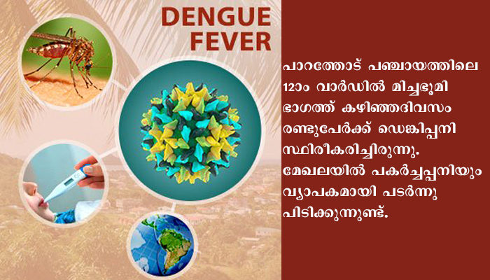 പാറത്തോട് പഞ്ചായത്തിലെ 12ാം വാര്‍ഡില്‍ മിച്ചഭൂമിഭാഗത്ത് കഴിഞ്ഞദിവസം രണ്ടുപേര്‍ക്ക് ഡെങ്കിപ്പനി സ്ഥിരീകരിച്ചിരുന്നു. മേഖലയില്‍ പകര്‍ച്ചപ്പനിയും വ്യാപകമായി പടര്‍ന്നുപിടിക്കുന്നുണ്ട്. റബര്‍പാല്‍ എടുത്തശേഷം കമഴ്ത്തി വയ്ക്കാത്ത ചിരട്ടകളില്‍ വെള്ളംനിറഞ്ഞ് കൊതുകുകള്‍ മുട്ടയിട്ടു പെരുകുകയാണ്. വീടുകള്‍തോറും പ്രചാരണവും സന്ദേശവുമായി ആരോഗ്യപ്രവര്‍ത്തകര്‍ രംഗത്തുണ്ട്. വീടിന്റെ പരിസരങ്ങളില്‍ വെള്ളം കെട്ടിനില്‍ക്കാനുള്ള സാഹചര്യം ഒഴിവാക്കണമെന്നും ആരോഗ്യ പ്രവര്‍ത്തകര്‍ നിര്‍ദേശിക്കുന്നു.