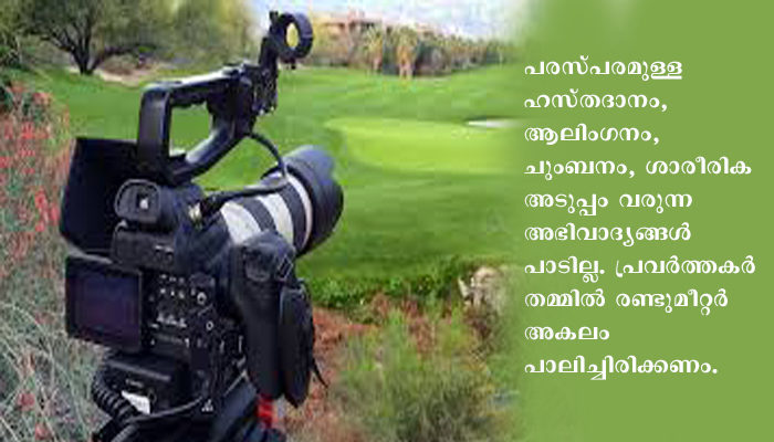 പരസ്പരമുള്ള ഹസ്തദാനം, ആലിംഗനം, ചുംബനം, ശാരീരിക അടുപ്പം വരുന്ന അഭിവാദ്യങ്ങള് പാടില്ല. പ്രവര്ത്തകര് തമ്മില് രണ്ടുമീറ്റര് അകലം പാലിച്ചിരിക്കണം. പങ്കുവച്ചുള്ള പുകവലി പാടില്ല. 60 വയസ്സിനു മുകളില് പ്രായമുള്ള നടീനടന്മാരും അണിയറ പ്രവര്ത്തകരും സെറ്റുകളില് പാടില്ല. അടുത്ത മൂന്നു മാസത്തേക്ക് ഈ നിബന്ധനകള് കര്ശനമായി പാലിക്കണം. മേക്കപ്പിന്റെ കാര്യത്തിലും കര്ശന നിര്ദേശങ്ങളുണ്ട്. എല്ലാ ഷൂട്ടിങ് സെറ്റുകളിലും കുളിക്കാനും കൈ കഴുകാനുമെല്ലാമുള്ള സംവിധാനങ്ങള് ഏര്പ്പാടാക്കണം. ഡിസ്പോസിബിള് സാമഗ്രികള് ഒരുതവണ മാത്രമേ ഉപയോഗിക്കാന് പാടുള്ളൂവെന്നും കര്ശന നിര്ദേശം നല്കിയിട്ടുണ്ട്.