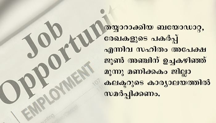 അപേക്ഷകന്റെ വിവരങ്ങള്, എന്റോള് ചെയ്ത തീയതി, പ്രവൃത്തിപരിചയം, അപേക്ഷകന് ഉള്പ്പെട്ട് വരുന്ന പോലീസ് സ്റ്റേഷന് തുടങ്ങിയവ രേഖപ്പെടുത്തി തയ്യാറാക്കിയ ബയോഡാറ്റ, രേഖകളുടെ പകര്പ്പ് എന്നിവ സഹിതം അപേക്ഷ ജൂണ് അഞ്ചിന് ഉച്ചകഴിഞ്ഞ് മൂന്നു മണിക്കകം ജില്ലാ കലക്ടറുടെ കാര്യാലയത്തില് സമര്പ്പിക്കണം.