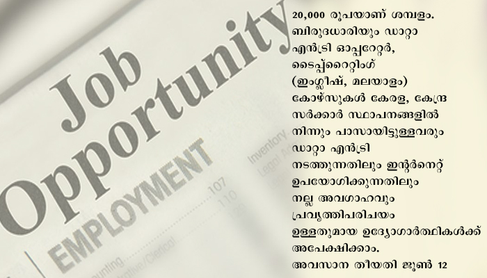 തൃശൂർ : ജില്ലാ നിയമ സേവന അതോറിറ്റിയുടെ ഓഫീസിൽ ഡാറ്റാ എൻട്രി ഓപ്പറേറ്ററുടെ ഒഴിവിലേക്ക് അപേക്ഷ ക്ഷണിച്ചു. നിയമ സേവനവുമായി ബന്ധപ്പെട്ട വിവരങ്ങൾ ഡാറ്റാ എൻട്രി ചെയ്യുന്നതിനും വെബ് സൈറ്റിൽ അപ്ലോഡ് ചെയ്യുന്നതിനും ഒരുവർഷത്തെ കരാറടിസ്ഥാനത്തിൽ യോഗ്യരായ ഉദ്യോഗാർത്ഥികളിൽ നിന്നുമാണ് അപേക്ഷ ക്ഷണിച്ചു. 20,000 രൂപയാണ് ശമ്പളം. ബിരുദധാരിയും ഡാറ്റാ എൻട്രി ഓപ്പറേറ്റർ, ടൈപ്പ്റൈറ്റിംഗ് (ഇംഗ്ലീഷ്, മലയാളം) കോഴ്സുകൾ കേരള, കേന്ദ്ര സർക്കാർ സ്ഥാപനങ്ങളിൽ നിന്നും പാസായിട്ടുള്ളവരും ഡാറ്റാ എൻട്രി നടത്തുന്നതിലും ഇന്റർനെറ്റ് ഉപയോഗിക്കുന്നതിലും നല്ല അവഗാഹവും പ്രവൃത്തിപരിചയം ഉള്ളതുമായ ഉദ്യോഗാർത്ഥികൾക്ക് അപേക്ഷിക്കാം. ജൂൺ 12 നകം തൃശൂർ ജില്ലാ നിയമ സേവന അതോറിറ്റി ഓഫീസിൽ ഫോട്ടോ സഹിതമുള്ള ബയോഡാറ്റയും യോഗ്യത തെളിയിക്കുന്ന രേഖകളുടെ സ്വയം സാക്ഷ്യപ്പെടുത്തിയ പകർപ്പുകളും സഹിതം നേരിട്ടോ തപാൽ മാർഗമോ അപേക്ഷിക്കണമെന്ന് സെക്രട്ടറി അറിയിച്ചു. വിലാസം: സെക്രട്ടറി, ജില്ലാ നിയമ സേവന അതോറിറ്റി, എ ഡി ആർ ബിൽഡിംഗ്, അയ്യന്തോൾ പി ഒ, തൃശൂർ. ഫോൺ: 0487 2363779.