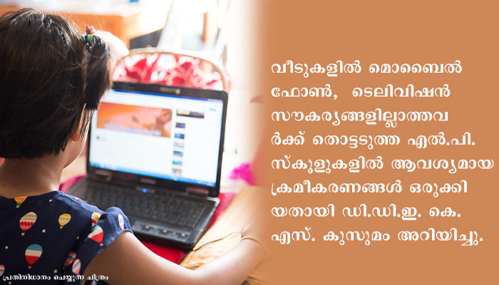 മലപ്പുറം: ജില്ലയില് വിദ്യാഭ്യാസ വകുപ്പിന്റെ ഫസ്റ്റ്ബെല് ഓണ്ലൈന് ക്ലാസുകളില് പങ്കെടുക്കുന്നതിന് വീടുകളില് മൊബൈല് ഫോണ്, ടെലിവിഷന് സൗകര്യങ്ങളില്ലാത്തവര്ക്ക് തൊട്ടടുത്ത എല്.പി. സ്കൂളുകളില് ആവശ്യമായ ക്രമീകരണങ്ങള് ഒരുക്കിയതായി ഡി.ഡി.ഇ. കെ. എസ്. കുസുമം അറിയിച്ചു. സ്കൂളുകള്ക്ക് പുറമെ പ്രാദേശിക ലൈബ്രററികളിലും ആവശ്യമെങ്കില് സൗകര്യമൊരുക്കാനാണ് തീരുമാനം. സ്കൂളുകളിലുള്ള ലാപ്ടോപ്പ്, ഇന്റര്നെറ്റ് സൗകര്യങ്ങളുടെ സഹായത്തോടെയാകും വിദ്യാര്ഥികള്ക്ക് പഠനം സാധ്യമാക്കുക.