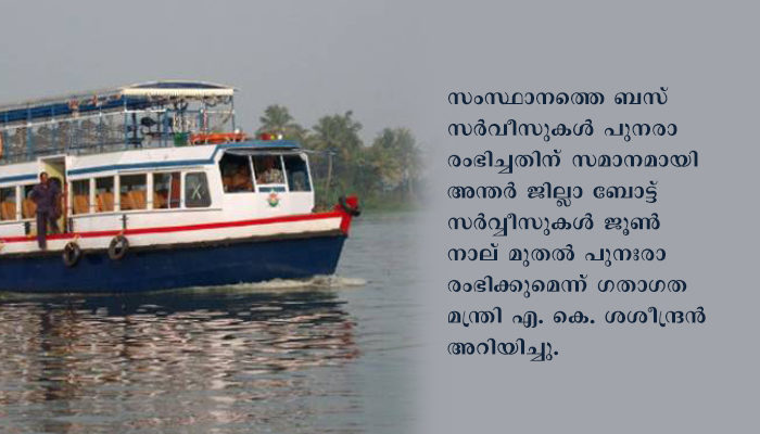 തിരുവനന്തപുരം: സംസ്ഥാനത്തെ ബസ് സര്‍വീസുകള്‍ പുനരാരംഭിച്ചതിന് സമാനമായി അന്തര്‍ ജില്ലാ ബോട്ട് സര്‍വ്വീസുകള്‍ ജൂണ്‍ നാല് മുതല്‍ പുനഃരാരംഭിക്കുമെന്ന് ഗതാഗത മന്ത്രി എ. കെ. ശശീന്ദ്രന്‍ അറിയിച്ചു. വര്‍ധിപ്പിച്ച ബോട്ട് യാത്രാകൂലി കുറച്ച് പഴയ നിരക്ക് പുനഃസ്ഥാപിക്കാനും തീരുമാനിച്ചിട്ടുണ്ട്. എല്ലാ സീറ്റുകളിലും യാത്രക്കാരെ അനുവദിക്കും. ബോട്ടില്‍ നിന്നുകൊണ്ടുള്ള യാത്ര അനുവദിക്കില്ല.
