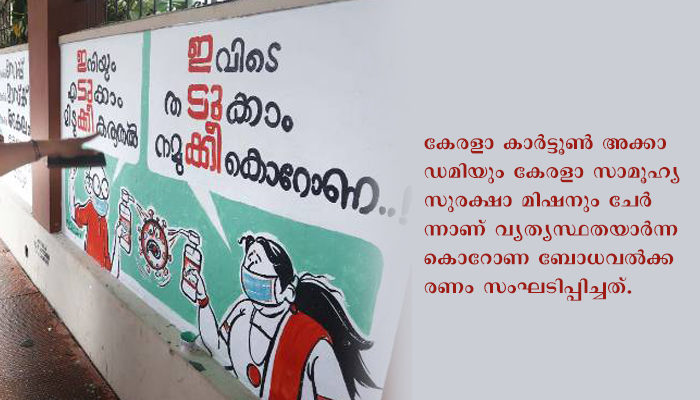 സംസ്ഥാന തലത്തില് നടത്തുന്ന കാര്ട്ടൂണ് ബോധവല്ക്കരണം ഇതിനോടകം 13 ജില്ലകള് പിന്നിട്ടു. കേരളാ കാര്ട്ടൂണ് അക്കാഡമിയുടെ നേതൃത്വത്തില് ഒമ്പത് കാര്ട്ടൂണിസ്റ്റുകളാണ് തൊടുപുഴയിലെത്തിയത്. ഓരോ ജില്ലയിലുമെത്തുമ്പോള് അതാതിടങ്ങളിലെ പ്രശസ്തരായ വ്യക്തികള്, ഭാഷ, സ്ഥലങ്ങള്, കലാരൂപങ്ങള്, ചരിത്രം എന്നിവയൊക്കെ കഥാപാത്രങ്ങളാകും. ഇടുക്കിയിലെത്തിയപ്പോള് കൊലുമ്പന്, ഇടുക്കി ഡാം, ചെറുതോണി അണക്കെട്ട്, ഇടുക്കിയില് ചിത്രീകരിച്ച സിനിമകള്, ഇടുക്കി ജില്ലക്കാരനായ സിനിമാ താരം ആസിഫ് അലി എന്നിവയൊക്കെ കഥാപാത്രങ്ങളായി മാറി. ആരോഗ്യ വകുപ്പിന്റെ നിര്ദ്ദേശങ്ങളിലൂടെയാണ് കാര്ട്ടൂണ് കഥാപാത്രങ്ങള് ജനങ്ങളോട് സംവദിക്കുക.
