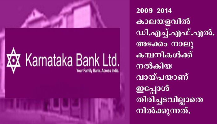 സംസ്ഥാനത്തെ സ്വകാര്യ ബാങ്കായ കര്ണാടക ബാങ്കില് നിന്ന് നാലു കമ്പനികള്ചേര്ന്ന് 285 കോടിയുടെ വായ്പ എടുത്തിരുന്നു. ദിവാന് ഹൗസിങ് ഫിനാന്സ് കോര്പറേഷന് ലിമിറ്റഡ്, റിലിഗറേ ഫിന്വെസ്റ്റ്, ഫെഡേഴ്സ് ഇലക്ട്രിക് ആന്ഡ് എന്ജിനിയറിങ് ലിമിറ്റഡ്, ലീല് ഇലക്ട്രിക്കല്സ് എന്നീ കമ്പനികല്ക്കെതിരെയാണ് ബാങ്ക് പരാതി നല്കിയിരിക്കുന്നത്. യാഥാക്രമം 180.13, 43.44, 41.30, 20.65 കോടി രൂപയാണ് ഇവര് വായ്പയായി എടുത്തിട്ടുള്ളത്.
