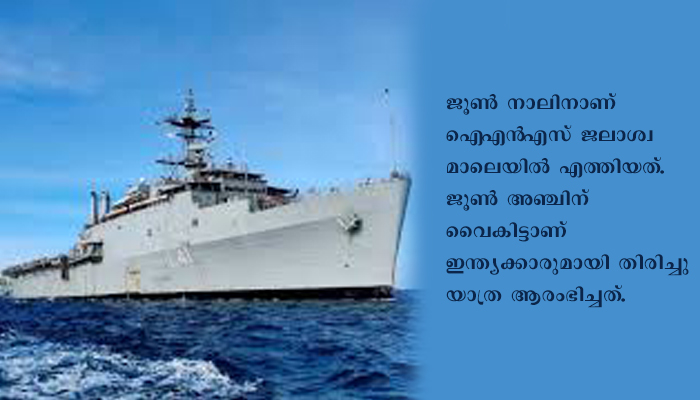 ന്യൂഡല്ഹി: ഓപ്പറേഷൻ സമുദ്ര സേതുവിന്റെ ഭാഗമായി നാവിക സേനയുടെ കപ്പൽ ഐഎൻഎസ് ജലാശ്വ മാലദ്വീപിൽ നിന്നും 700 ഇന്ത്യക്കാരുമായി തൂത്തുക്കുടിയിലേക്ക് പുറപ്പെട്ടു. സമുദ്രസേതു ദൗത്യത്തിന്റെ ഭാഗമായുള്ള മൂന്നാം യാത്രക്കായി ജൂൺ നാലിനാണ് ഐഎൻഎസ് ജലാശ്വ മാലെയിൽ എത്തിയത്. ജൂൺ അഞ്ചിന് വൈകിട്ടാണ് ഇന്ത്യക്കാരുമായി തിരിച്ചു യാത്ര ആരംഭിച്ചത്. യാത്ര പുറപ്പെടുന്ന സമയത്ത് മാലദ്വീപിന്റെ തീരസംരക്ഷണ സേനയുടെ കമാൻഡൻഡ് കേണൽ മൊഹമ്മദ് സലീം സംബന്ധിച്ചു.