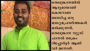 സെയ്ദാബാദ് (തെലുങ്കാന) : തെലുങ്കാനയിൽ സെയ്ദാബാദിലെ ഡി മനോജ് കുമാർ (33) ആണ് മരിച്ചത്. ഞായറാഴ്ച രാവിലെയാണ് മരണം സ്ഥിരീകരിച്ചത്. തെലുങ്കാനയിൽ ആദ്യമായാണ് കൊറോണ ബാധിച്ച ഒരു മാധ്യമപ്രവർത്തകൻ മരിക്കുന്നത്. തെലുങ്കാന ന്യൂസ് ചാനൽ ക്രൈം റിപ്പോർട്ടർ ആണ് ഡി മനോജ്,
