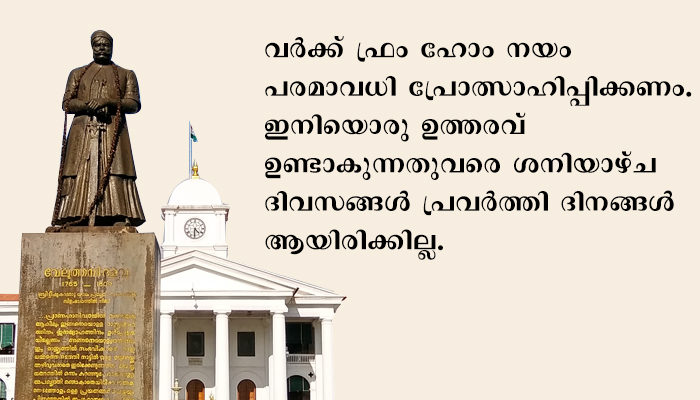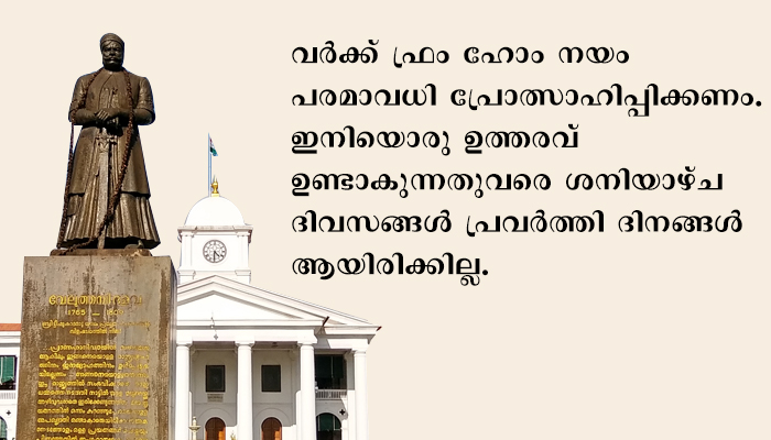 വർക്ക് ഫ്രം ഹോം നയം പരമാവധി പ്രോത്സാഹിപ്പിക്കണം. ഇനിയൊരു ഉത്തരവ് ഉണ്ടാകുന്നതുവരെ ശനിയാഴ്ച ദിവസങ്ങൾ പ്രവർത്തി ദിനങ്ങൾ ആയിരിക്കില്ല. കെട്ടികിടക്കുന്ന ഫയലുകൾ തീർപ്പാക്കാൻ ജീവനക്കാർ പ്രത്യേക പരിഗണന നൽകേണ്ടതും ഓഫീസ് മേലധികാരികൾ ഇക്കാര്യം പരിശോധിച്ച് ഉറപ്പുവരുത്തേ ണ്ടതുമാണ്.