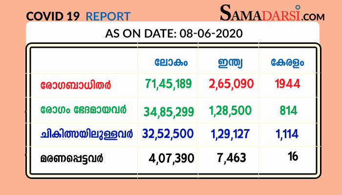 കേരളത്തിൽ തിങ്കളാഴ്ച(08/06/2020) 91 പേർക്ക് കോവിഡ്-19 സ്ഥിരീകരിച്ചു; ചികിത്സയിലുള്ളത് 1174 പേർ; ആറ് പുതിയ ഹോട്ട് സ്പോട്ടുകൾ; ഒരു മരണം