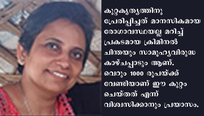 ഉ : കുറ്റകൃത്യത്തിനു പ്രേരിപ്പിച്ചത് മാനസികമായ രോഗാവസ്ഥയല്ല മറിച്ച് പ്രകടമായ ക്രിമിനല് ചിന്തയും സാമൂഹ്യവിരുദ്ധ കാഴ്ചപ്പാടും ആണ്. വെറും 1000 രൂപയ്ക്ക് വേണ്ടിയാണ് ഈ കുറ്റം ചെയ്തത് എന്ന് വിശ്വസിക്കാനും പ്രയാസം.