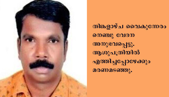 തിങ്കളാഴ്ച വൈകുന്നേരം നെഞ്ചു വേദന അനുഭവപ്പെട്ടു. ആശുപത്രിയിൽ എത്തിച്ചപ്പോഴേക്കും മരണമടഞ്ഞു. ജിദ്ദ വാട്ടർ കമ്പനിയിലെ ഡ്രൈവർ ആയിരുന്നു. മക്കൾ: ഷിഥുൻ ഗംഗ, ഷിൽബി ഗംഗ.