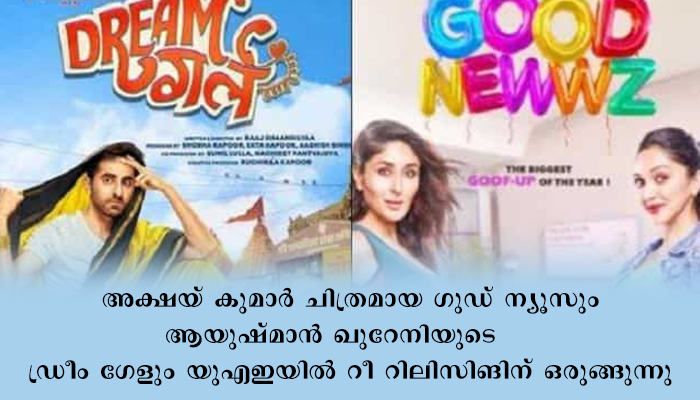 മുംബൈ: അക്ഷയ് കുമാര്‍ ചിത്രമായ ഗുഡ് ന്യൂസും ആയുഷ്മാന്‍ ഖുറേനിയുടെ ഡ്രീം ഗേളും യുഎഇയില്‍ റീ റിലിസിങിന് ഒരുങ്ങുന്നു. ലോക്ക് ഡൗണിനെ തുടര്‍ന്നിട്ട യുഎഇ തിയറ്ററുകള്‍ വീണ്ടും തുറന്നിതിനെ തുടര്‍ന്നാണ് നടപടി.