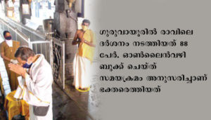 ഗുരുവായൂര്: ഗുരുവായൂരില് ബുധനാഴ്ച രാവിലെ ദര്ശനം നടത്തിയത് 88 പേര്. ഓണ്ലൈന്വഴി ബുക്ക് ചെയ്ത് സമയക്രമം അനുസരിച്ചാണ് ഭക്തരെത്തിയത്. 288 ഭക്തര് ഓണ്ലൈനില് ബുക്ക് ചെയ്തിരുന്നെങ്കിലും 88 പേര് മാത്രമേ എത്തിയുള്ളൂ. രാവിലെ 9.15ന് 13 പേരടങ്ങിയ ആദ്യസംഘത്തെ ക്ഷേത്രത്തിനുള്ളിലേക്ക് കടത്തിവിട്ടു. കിഴക്കെ വലിയ നടപന്തലില് ദര്ശനത്തിനെത്തിയ ഭക്തര്ക്ക് ആരോഗ്യപ്രവര്ത്തകര് ആദ്യം സാനിറ്റൈസര് നല്കി. തുടര്ന്ന് രേഖകള് പരിശോധിച്ചശേഷം തെര്മല് സ്കാനര് ഉപയോഗിച്ച് താപനില നിരീക്ഷിച്ചു. വീണ്ടും സാനിറ്റൈസര് നല്കിയശേഷമാണ് വരിയിലേക്കു കടത്തിവിട്ടത്. സാമൂഹിക അകലം പാലിച്ചാണ് ഭക്തര് ദര്ശനം നടത്തിയത്.