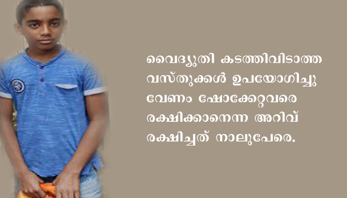 സ്കൂളില് സയന്ക്ലാസില് പഠിച്ച അറിവാണ് നാല് ജീവനുകള് രക്ഷിക്കാന് അദ്വൈതിന് കരുത്തായത്. ‘വൈദ്യുതി കടത്തിവിടാത്ത വസ്തുക്കള് ഉപയോഗിച്ചുവേണം ഷോക്കേറ്റവരെ രക്ഷിക്കാനെന്ന് ഞാന് ക്ലാസില് പഠിച്ചിരുന്നു. കൈയില്കിട്ടിയത് ഒരു ടൈല്സിന്റെ കഷണമാണ്. അതെടുത്ത് ആഞ്ഞൊരേറ് കൊടുത്തു.” അദ്വൈത് സംഭവം വിവരിച്ചു. പഠനത്തില് മിടുക്കനായ എട്ടാം ക്ലാസുകാരനായ അദ്വൈത് മണലൂര് വെളക്കേത്ത് രഖീഷിന്റെ മകനാണ്.