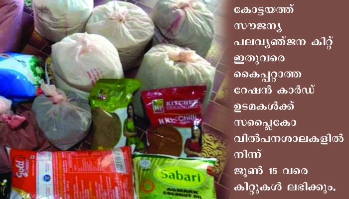 കോട്ടയം: ലോക്ഡൗണ് സാഹചര്യത്തില് സംസ്ഥാന സര്ക്കാര് പ്രഖ്യാപിച്ച സൗജന്യ പലവ്യഞ്ജന കിറ്റ് ഇതുവരെ കൈപ്പറ്റാത്ത റേഷന് കാര്ഡ് ഉടമകള്ക്കായി വിതരണം ആരംഭിച്ചു. സപ്ലൈകോ വില്പനശാലകളില് നിന്ന് ജൂണ് 15 വരെ കിറ്റുകള് ലഭിക്കുമെന്ന് ചീഫ് മാനേജിംഗ് ഡയറക്ടര് പി. എം. അലി അസ്ഗര് പാഷ അറിയിച്ചു.