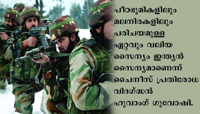 പീഠഭൂമികളിലും മലനിരകളിലും പരിചയമുള്ള ഏറ്റവും വലിയ സൈന്യം അമേരിക്കയുടേതോ റഷ്യയുടേതോ മറ്റേതെങ്കിലും യൂറോപ്യന് രാജ്യത്തിന്റേതോ അല്ല. ഇന്ത്യന് സൈന്യമാണ് ഇക്കാര്യത്തില് ഏറ്റവും മികച്ചതും പരിശീലനം സിദ്ധിച്ചതെന്നുമാണ് അദ്ദേഹം എഴുതിയിരിക്കുന്നത്. ഇന്ത്യയുടെ മൗണ്ടന് ബ്രിഗേഡിനെക്കുറിച്ചാണ് ഗുവോഷിയുടെ പരാമര്ശം.12 ഡിവിഷനുകളിലായി രണ്ട് ലക്ഷം സൈനികരുള്ള ഇന്ത്യയാണ് പര്വ്വത യുദ്ധത്തില് ലോകത്തെ ഏറ്റവും വലുതും ശക്തവും. വിദഗ്ദ്ധരായ പര്വ്വതാരോഹകരെ ഇന്ത്യ സൈന്യത്തില് ചേര്ത്തിട്ടുണ്ട്. അന്പതിനായിരം വരുന്ന സ്ട്രൈക്ക് ഫോഴ്സുമുണ്ട് ഇന്ത്യക്ക്. ഏതെല്ലാം തന്നെ വിവരണാത്മകമായി തന്നെ ഗുവോഷി ചൂണ്ടിക്കാട്ടുന്നു.