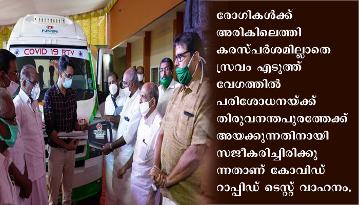 രോഗികള്ക്ക് അരികിലെത്തി കരസ്പര്ശമില്ലാതെ സ്രവം എടുത്ത് വേഗത്തില് പരിശോധനയ്ക്ക് തിരുവനന്തപുരത്തേക്ക് അയക്കുന്നതിനായി സജീകരിച്ചിരിക്കു ന്നതാണ് കോവിഡ് റാപ്പിഡ് ടെസ്റ്റ് വാഹനം. ഒരു ഡോക്ടര്, രണ്ടു നഴ്സുമാര്, ഡ്രൈവറു മാണു വാഹനത്തിലുണ്ടാകുക. കേരളത്തിലാദ്യമായാണ് ഇത്തരത്തില് ഒരു സംവിധാനം ഏര്പ്പെടുത്തിയത്. ജില്ലാ ഭരണകൂടവും എന്.എം.ആര് ഫൗണ്ടേഷന്റേയും നേതൃത്വത്തിലാണ് റാപ്പിഡ് ടെസ്റ്റ് വാഹനത്തിന്റെ നിര്മ്മാണം.