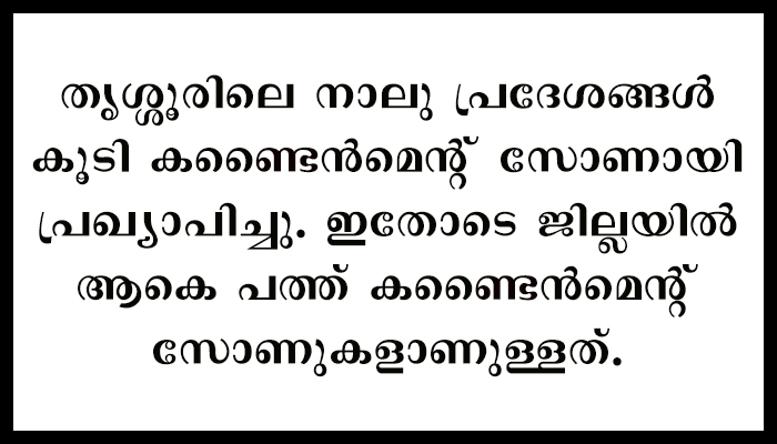 വടക്കെക്കാട്, അടാട്ട്, അവണൂര്, ചേര്പ്പ്, തൃക്കൂര്, പഞ്ചായത്തുകളും ഇരിഞ്ഞാലക്കുട നഗരസങയുടെ ഒന്നു മുതല് പത്തു വരെയുള്ള വാര്ഡുകളും (മൂര്ക്കനാട്, ബംഗ്ലാവ്, പുത്തന് തോട് കരുവന്നൂര് നോര്ത്ത്, പീച്ചാംപിള്ളിക്കോണം, ഹോളിക്രോസ് ചര്ച്ച്, മാപ്രാണം, മാടായിക്കോണം സ്കൂള്, നമ്പ്യാങ്കാവ് ക്ഷേത്രം, കുഴക്കാട്ടുകോണം) 32 മുതല് 41 വരെയുള്ള വാര്ഡുകളും (സിവില്സ്റ്റേഷന്, പൊറാത്തിശേരി പോസ്റ്റ് ഓഫീസ്, പോറാത്തിശേരി, മഹാത്മ സ്കൂള്, ഫയര് സ്റ്റേഷന്, ബ്ലോക്ക് ഓഫീസ്, താളിയക്കോണം, കല്ലട, വടക്കെ താളിയക്കോണം, പുറത്താട്) എന്നിവ നേരത്തെ പ്രഖ്യാപിച്ച കണ്ടൈന്മെന്റ് സോണുകളുടെ പട്ടികയില് ഉള്പ്പെടും.