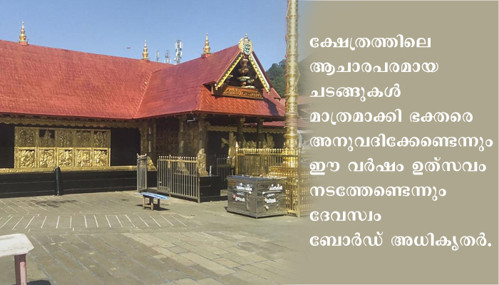 തിരുവനന്തപുരം: കോവിഡ് 19ന്റെ പശ്ചാത്തലത്തിൽ ശബരിമല ക്ഷേത്രത്തിൽ ഭക്തരെ അനുവദിക്കേണ്ടെന്നും ഈ വർഷം ഉത്സവം നടത്തേണ്ടെന്നും തീരുമാനി ച്ചതായി ദേവസ്വം മന്ത്രി കടകംപള്ളി സുരേന്ദ്രൻ വാർത്താസമ്മേളനത്തിൽ പറഞ്ഞു. ദേവസ്വം ബോർഡ് അധികൃതരും ക്ഷേത്രം തന്ത്രി കണ്ഠരരു മഹേഷ് മോഹനരരുമായും മന്ത്രിയുടെ അധ്യക്ഷതയിൽ നടത്തിയ ചർച്ചയിലാണ് തീരുമാനം. അതേസമയം ക്ഷേത്രത്തിലെ ആചാരപരമായ ചടങ്ങുകൾ നടത്തും. ചർച്ചയിലെ തീരുമാനങ്ങൾ മുഖ്യമന്ത്രിയെ അറിയിച്ചതായും മന്ത്രി പറഞ്ഞു.