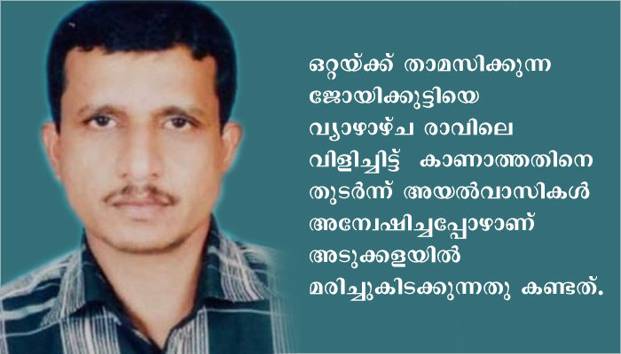 കണ്ണൂര്‍: കണ്ണൂരില്‍ വീടിനുള്ളില്‍ സംശയകരമായ സാഹചര്യത്തില്‍ മധ്യ വയസ്‌കനെ മരിച്ചനിലയില്‍ കാണപ്പെട്ടു. അയ്യമലയില്‍ ജോയിക്കുട്ടി(52)യാണ് മരിച്ചത്. ചെറുപുഴ കുണ്ടംതടത്തില്‍ ഒറ്റയ്ക്ക് താമസിക്കുന്നയാളെയാണ് അടുക്കളയില്‍ മരിച്ച നിലയില്‍ കണ്ടെത്തിയത്. വ്യാഴാഴ്ച രാവിലെ വിളിച്ചിട്ട് ഇയാളെ കാണാത്തതിനെ തുടര്‍ന്ന് അയല്‍വാസികള്‍ അന്വേഷിച്ചപ്പോഴാണ് മരിച്ചുകിടക്കുന്നതു കണ്ടത്. ചെറുപുഴ സ്റ്റേഷനിലെ എസ്‌ഐമാരായ മഹേഷ് ആര്‍ നായര്‍, സി തമ്പാന്‍, കെ പി ഉണ്ണികൃഷ്ണന്‍ എന്നിവരുടെ നേതൃത്വത്തില്‍ ഇന്‍ക്വസ്റ്റ് നടത്തി. പുളിങ്ങോം മെഡിക്കല്‍ ഓഫീസറുടെ നേതൃത്വത്തില്‍ ആരോഗ്യ പ്രവര്‍ത്തകരും സ്ഥലത്തെത്തി എല്ലാ സുരക്ഷാ ക്രമീകരണങ്ങളോടെയാണ് മൃതദേഹം എടുത്തത്. പരേതനായ ആന്റണി- ത്രേസ്യാമ്മ ദമ്പതികളുടെ മകനാണ്.