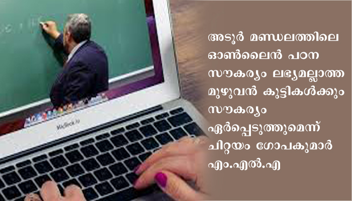 പത്തനംതിട്ട : അടൂര്‍ മണ്ഡലത്തിലെ ഓണ്‍ലൈന്‍ പഠന സൗകര്യം ലഭ്യമല്ലാത്ത മുഴുവന്‍ കുട്ടികള്‍ക്കും സൗകര്യം ഏര്‍പ്പെടുത്തുമെന്ന് ചിറ്റയം ഗോപകുമാര്‍ എംഎല്‍ എ പറഞ്ഞു. അടൂര്‍ ബി ആര്‍ സിയുടെ കീഴിലുള്ള പഞ്ചായത്ത് പ്രസിഡന്റുമാരുടെയും വിദ്യാഭ്യാസ സ്ഥിരം സമിതി  അധ്യക്ഷന്മാരുടെയും, ബി.ആര്‍.സി. കോ-ഓര്‍ഡിനേറ്റര്‍മാരുടെയും ഹെഡ്മാസ്റ്റര്‍മാരുടെയും യോഗം അടൂര്‍ ബിആര്‍സിയില്‍ ചിറ്റയം ഗോപകുമാര്‍ എംഎല്‍എ ഉദ്ഘാടനം ചെയ്തു. എല്ലാ പഞ്ചായത്തുകളിലും ലൈബ്രറികള്‍, അംഗന്‍വാടികള്‍, വിജ്ഞാന്‍വാടികള്‍ എന്നിവിടങ്ങളില്‍ ടെലിവിഷന്‍ സ്ഥാപിച്ചു.