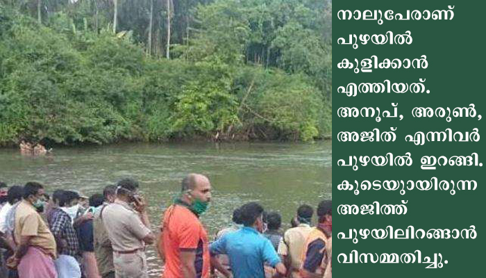 നാലുപേരാണ് പുഴയിൽ കുളിക്കാൻ എത്തിയത്. അനൂപ്, അരുൺ, അജിത് എന്നിവർ പുഴയിൽ ഇറങ്ങി. കൂടെയുണ്ടായിരുന്ന അജിത്ത് (18) പുഴയിലിറങ്ങാൻ വിസമ്മതിച്ചു. നാലുപേരിൽ ഒരാൾ വിദ്യാർത്ഥിയും മൂന്നുപേർ നിർമാണ തൊഴിലാളികളുമാണ്. അജിത്ത് വിവരമറിയിച്ചതിനെ തുടർന്ന് പോലീസും തളിപ്പറമ്പിൽ നിന്നും ഇരിട്ടിയിൽ നിന്നും എത്തിയ ഫയർഫോഴ്സും തിരച്ചിൽ നടത്തിവരികയാണ്. ശക്തമായ മഴയും ഇരുണ്ട കാലാവസ്ഥയും തിരച്ചിലിനും തടസ്സപ്പെടുത്തുന്ന സ്ഥിതിയാണുളളത്.